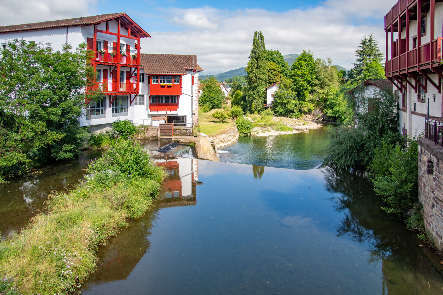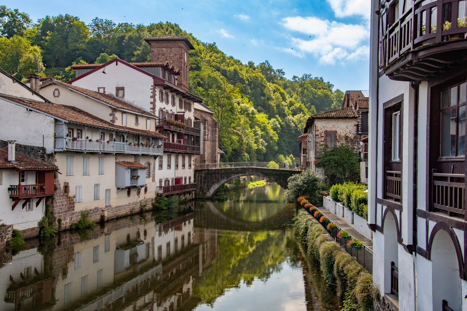 De dorpskern ziet er nog steeds zo uit als eeuwen geleden: een hoofdstraat met keien, overdekte wasplaatsen en middeleeuwse huisjes, aflopend naar de beroemde brug over de Nive. De rivier speelt een centrale rol in het dorpsbeeld, met huizen en balkons die over de rivier hangen. De Notre-Dame-du-Bout-du-Pont is het belangrijkste religieuze monument van het dorp. Helaas konden wij de kerk niet bezoeken tijdens ons bezoek, aangezien er toen net een begrafenis bezig was. De poort van Saint-Jacques is zelfs onderdeel van het UNESCO-werelderfgoed vanwege de pelgrimsroutes over de Camino. Deze poort vind je op de plek waar de rue de la Citadelle een scherpe bocht naar rechts maakt en de weg rechtdoor overgaat in de Chemin de la Porte de Saint-Jacques.