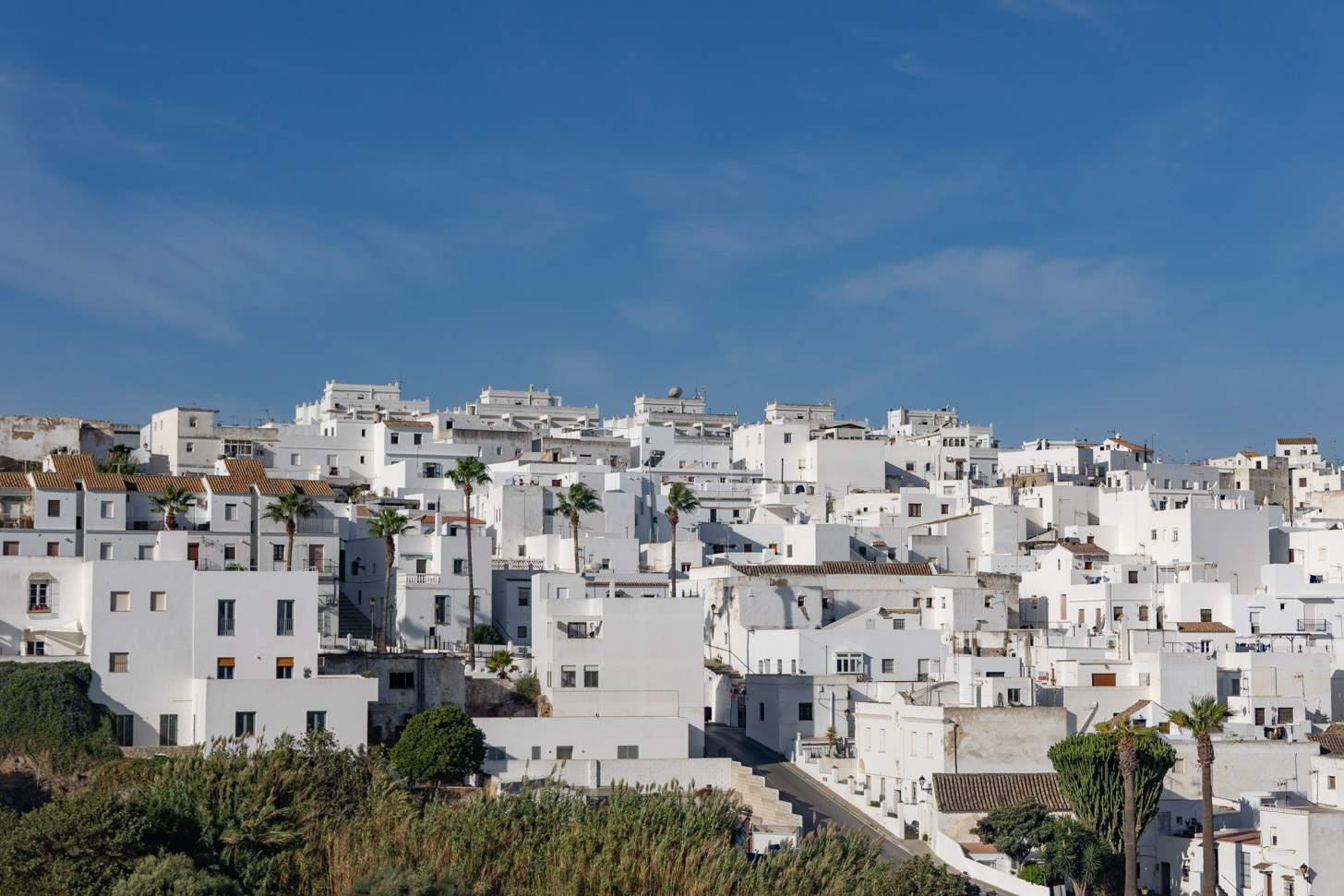 Wat Vejer de la Frontera verder zo bijzonder maakt, is de ligging bovenop een heuvel, met een spectaculair uitzicht over het omringende landschap en zelfs tot aan de Atlantische Oceaan. Binnen de stadsmuren liggen pleintjes waar sinaasappelbomen schaduw bieden, eeuwenoude kerken en resten van het Moorse verleden. Het fort en de stadspoorten herinneren aan de strategische rol die Vejer eeuwenlang gespeeld heeft. Juist de mix van Andalusische en Moorse invloeden geeft het dorp zijn eigen karakter. Daarbij is Vejer een levendige plaats gebleven, met gezellige bars, restaurants en winkeltjes die de witte straten extra sfeer geven.