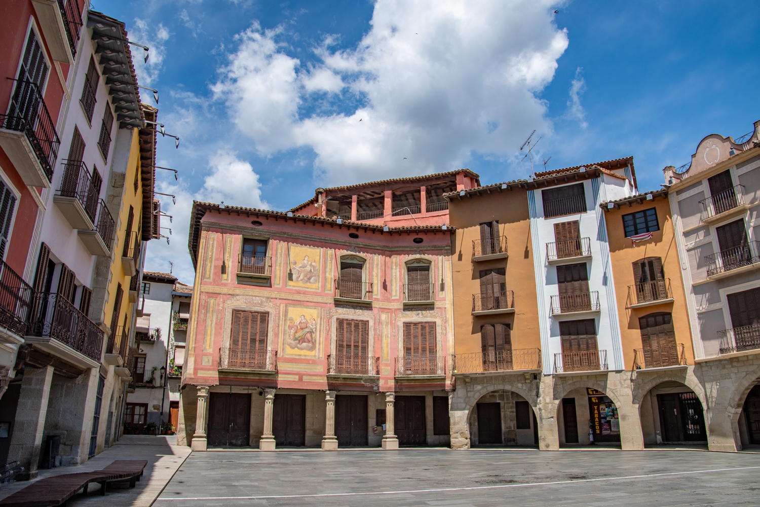De Plaza Mayor is het kloppende hart van Graus. Dit onregelmatig vijfhoekig plein dateert uit de tweede helft van de 16e eeuw en is omringd door arcades, houten balkons en kleurrijke herenhuizen. Opvallende gebouwen zijn Casa del Barón en Casa Heredia, die versierd zijn met prachtige beschilderingen. Het stadhuis, gebouwd in renaissancestijl van baksteen met mudéjar-accenten, met houten balkon en arcaden. Op het plein worden markten, evenementen en traditionele feestelijkheden, zoals de Mojiganga en het dansen van zwaarden en linten, gehouden. Onder de arcades zitten cafés en winkels, wat het plein zijn gezellige sfeer geeft.